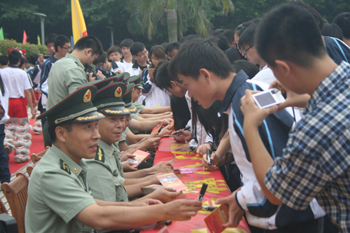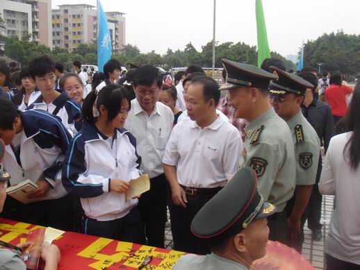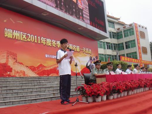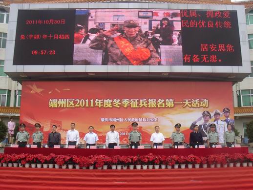 本网讯(记者 方敏 张秋萍 蓝绮茜)“国无防不立,民无兵不安”。10月30日,肇庆市端州区在我校国砚广场隆重举行2011年冬季征兵报名活动,动员全区各基层党委、政府、社会各界和广大人民群众关心和支持征兵工作。肇庆军分区副司令员刘梅大校、端州区人民武装部部长姚永红上校、校党委副书记叶峥嵘等出席。