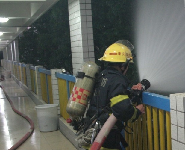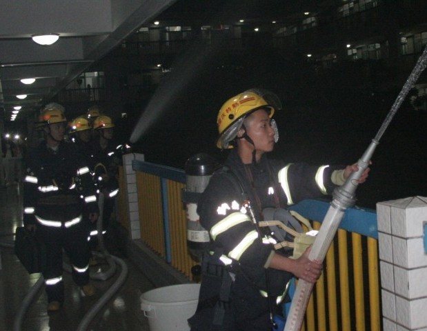 当晚7时30分,20台各种消防车辆有序驶入海容路、紫荆校道预定位置,11个中队的消防官兵悉数到位。指挥员一声令下,消防官兵根据分工迅速展开行动,铺设水带、启动消防水泵等,然后,兵分两路,一路操纵消防登高平台去往E栋南面进行高层勘察工作,确认现场情况后进行高空灭火。另一路消防官兵手持消防水枪火速进入宿舍内部逐层探查,确认目标位置后开展灭火行动。随着巨大的水柱从高压水枪喷出,水雾很快弥漫整栋公寓。