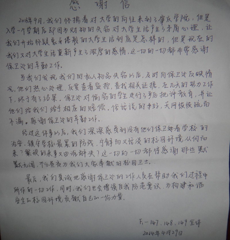 为表示感谢,明智书院F栋女生部分宿舍发来感谢信,对我处的辛勤劳动表示真诚的感谢。同时,希望广大师生遵纪守法,提高防盗、防骗等自我防范意识,发现违法、违规分子及时向我处报告,校园报警电话:2716280。