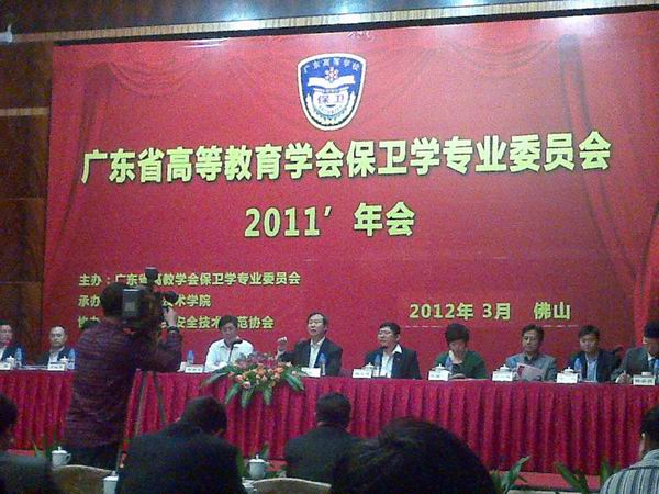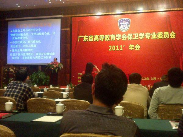 3月的佛山,绿树滴翠,繁花盛开,生机盎然。广东高教保卫学会2011,年会于3月28-30日在佛山市财神酒店召开。数百名教育厅、公安厅、安全厅和高校领导、保卫干部汇集在这里,共商高校保卫工作创新发展大计,描绘学会科学发展蓝图。参加会议的领导和嘉宾有佛山市政协杨晓光主席,学会理事长喻世友教授,省教育厅安保处陈日文处长,公安厅文保处何翔处长,安全厅陈丽青处长,副理事长中山大学保卫处范元办处长、华南理工大学保卫处叶汉钧处长,学会秘书长杨小报等。我处毛致光处长和黄镜辉副处长参加了这次会议。会议增补了毛致光处长为高教保卫学会常务理事。