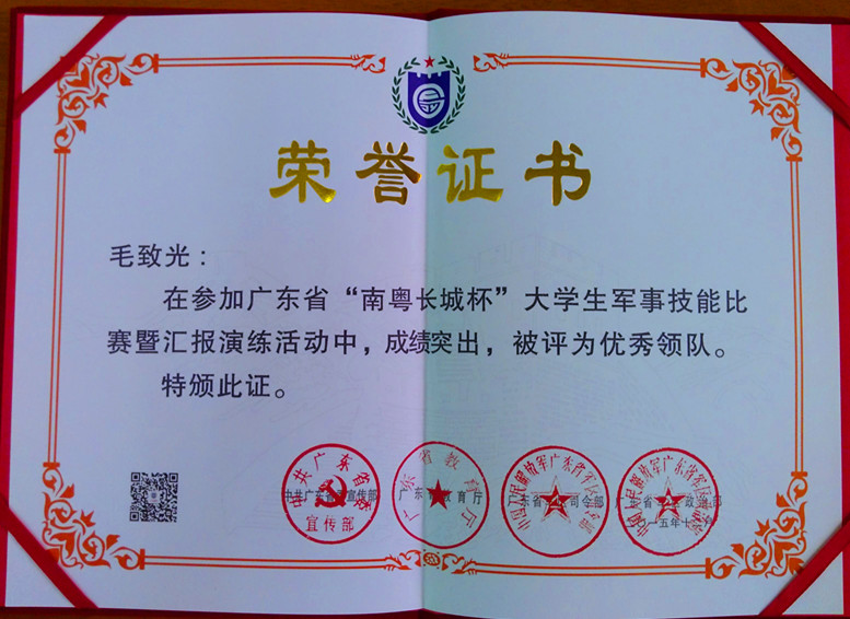 据悉,我校武装部组织21名学生参赛,本次比赛从准备阶段、组织训练到圆满结束历时2个多月。为确保参赛队员全身心投入训练,我校武装部积极协调相关部门,为学生协调上课时间,并联系肇庆市军分区安排教练员对参赛队员进行培训。参赛队员在2个多月的时间里刻苦训练、挥洒汗水,最终取得了该项赛事团体三等奖、第三赛区军体拳三等奖、队列三等奖的佳绩,我校武装部部长毛致光被评为“优秀领队”。