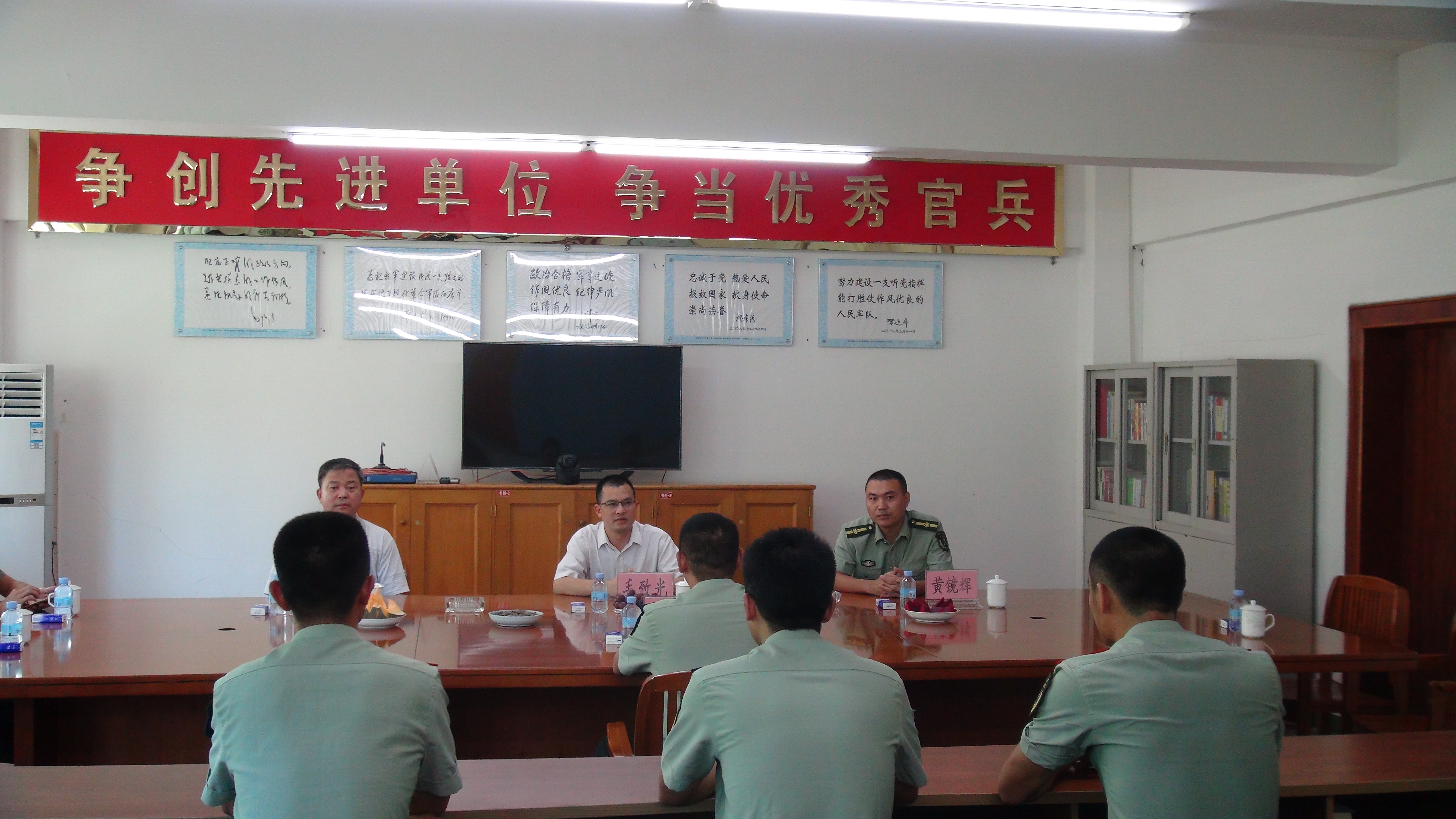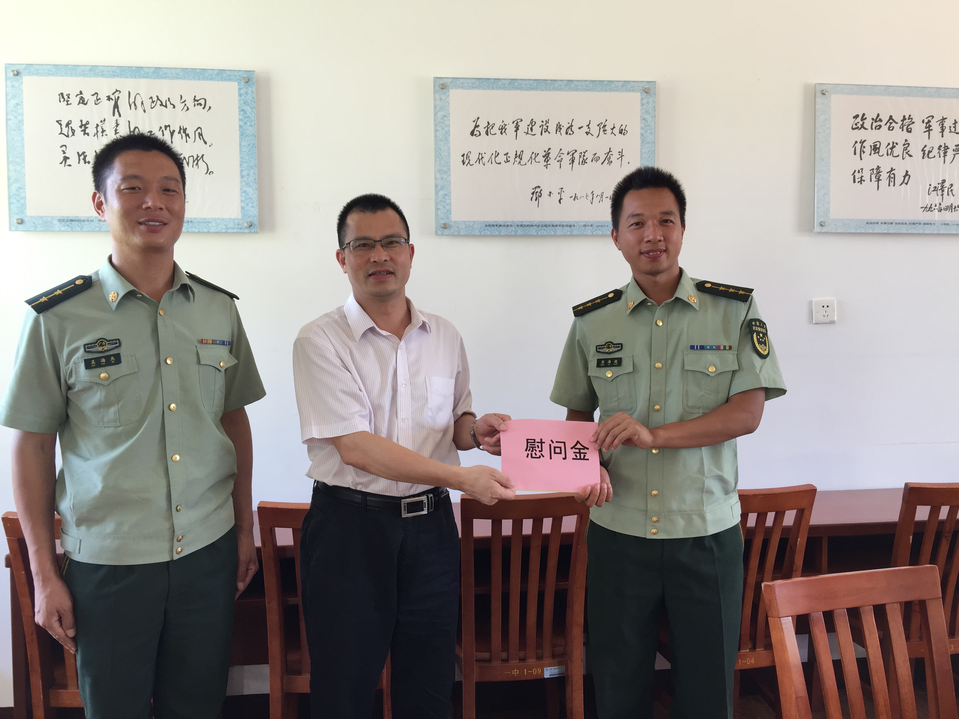 “八一”建军节即将到来,7月21日下午,我部领导班子代表学校分别前往武警肇庆市支队机动中队以及武警肇庆市支队教导队看望驻地武警官兵,毛致光部长一行向驻地官兵致以亲切问候并送去慰问金。 我校时刻密切与肇庆驻军的联系,每年建军节均对武警肇庆市相关单位进行走访慰问,切实做好拥军优属工作。