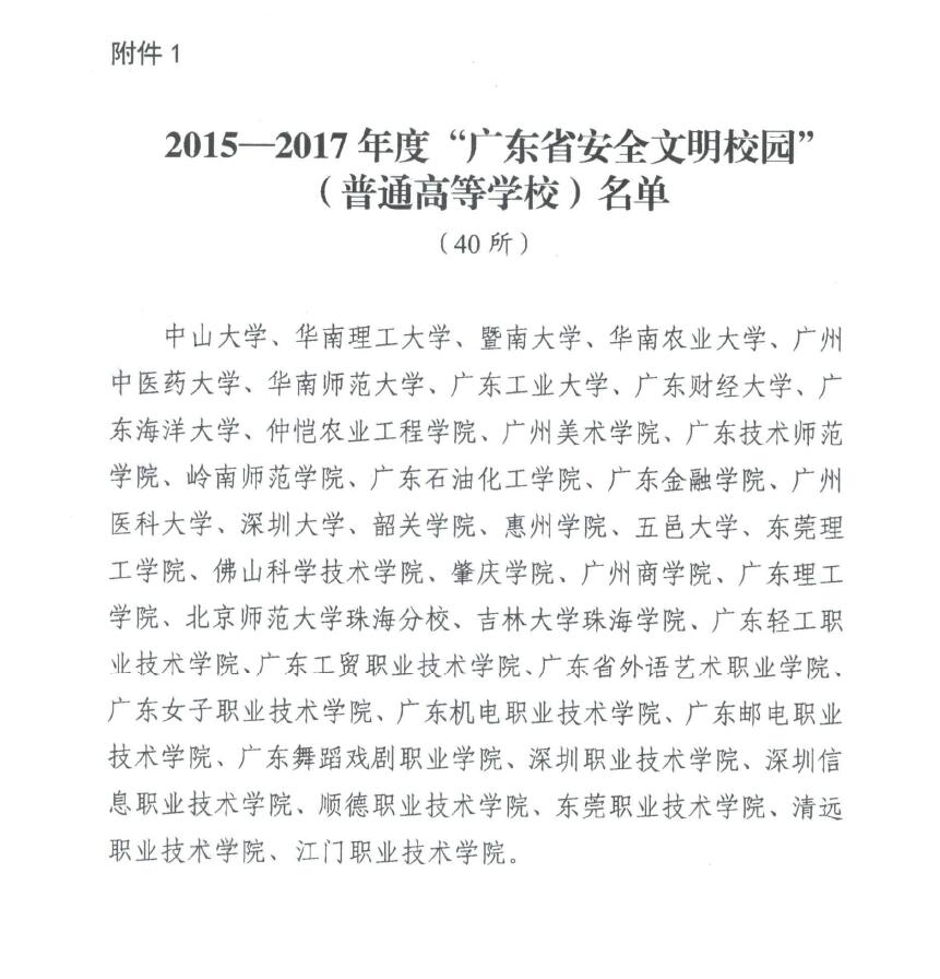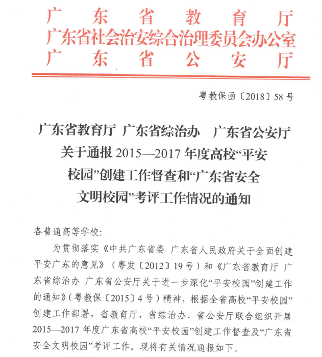 近日,省教育厅、省综治办和省公安厅联合通报“平安校园”创建工作督查和“广东省安全文明校园”考评工作情况。我校继2015年获评为2012——2014年度“广东省安全文明校园”后,再度登上光荣榜,获评为2015——2017年度“广东省安全文明校园”。