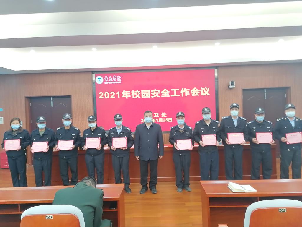 武装部保卫处处长黄镜辉总结了2020年新冠疫情下我处完成的工作任务,取得的成绩与存在的不足,并提出了在新的一年中的工作计划以及努力方向,黄镜辉代表保卫处对大家的辛勤工作和辛苦付出表示感谢。会议表彰优秀校卫队员,李副校长为获奖队员颁发荣誉证书。
