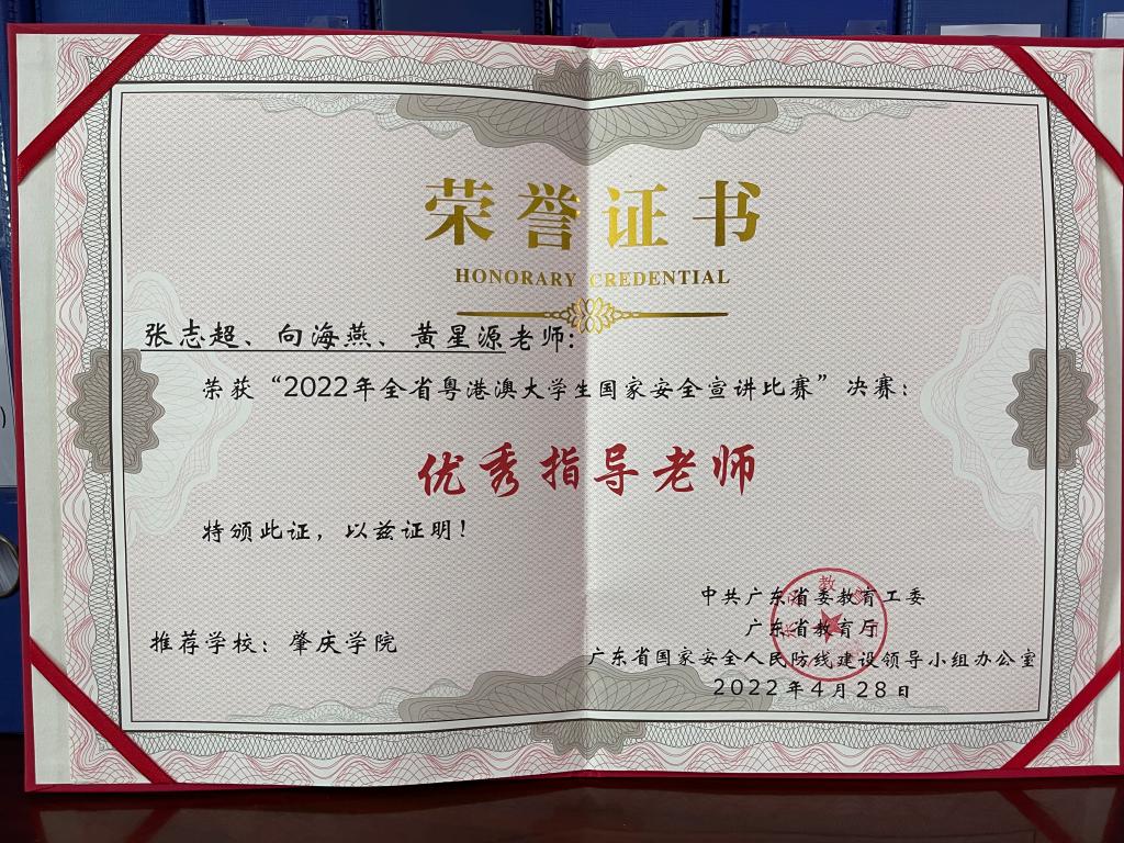 日前,由中共广东省委教育工委、广东省教育厅、广东省国家安全人民防线建设领导小组办公室联合主办的2022年全省粤港澳大学生国家安全宣讲比赛在广州举行,我校文学院21级汉语言文学专业学生吴培桦以《国家安全一切为了人民,一切依靠人民》为题参与角逐,最终荣获二等奖,我校也获评“优秀组织奖”,我处张志超科长等荣获“优秀指导老师”。
