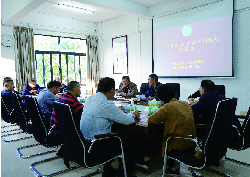 我部部长黄镜辉宣读了学校关于开展2023年“119消防安全宣传月”活动的方案,部署了相关工作。在“119消防安全宣传月”活动期间,学校将通过组织开展消防安全知识宣传教育、灭火实操和应急逃生疏散演练、火灾隐患自查自改、宣传消防法律法规、普及消防安全知识等一系列活动,增强全校师生消防安全意识,提高广大师生逃生自救应急处置能力,持续推动学校平安建设工作向上向好发展。