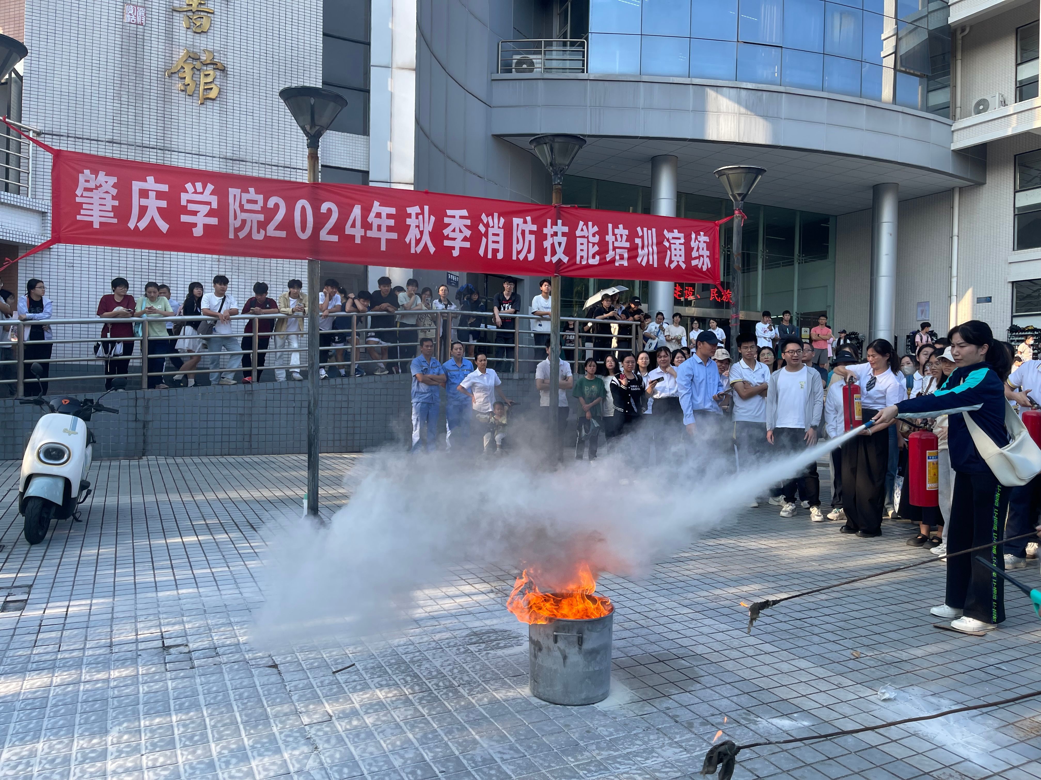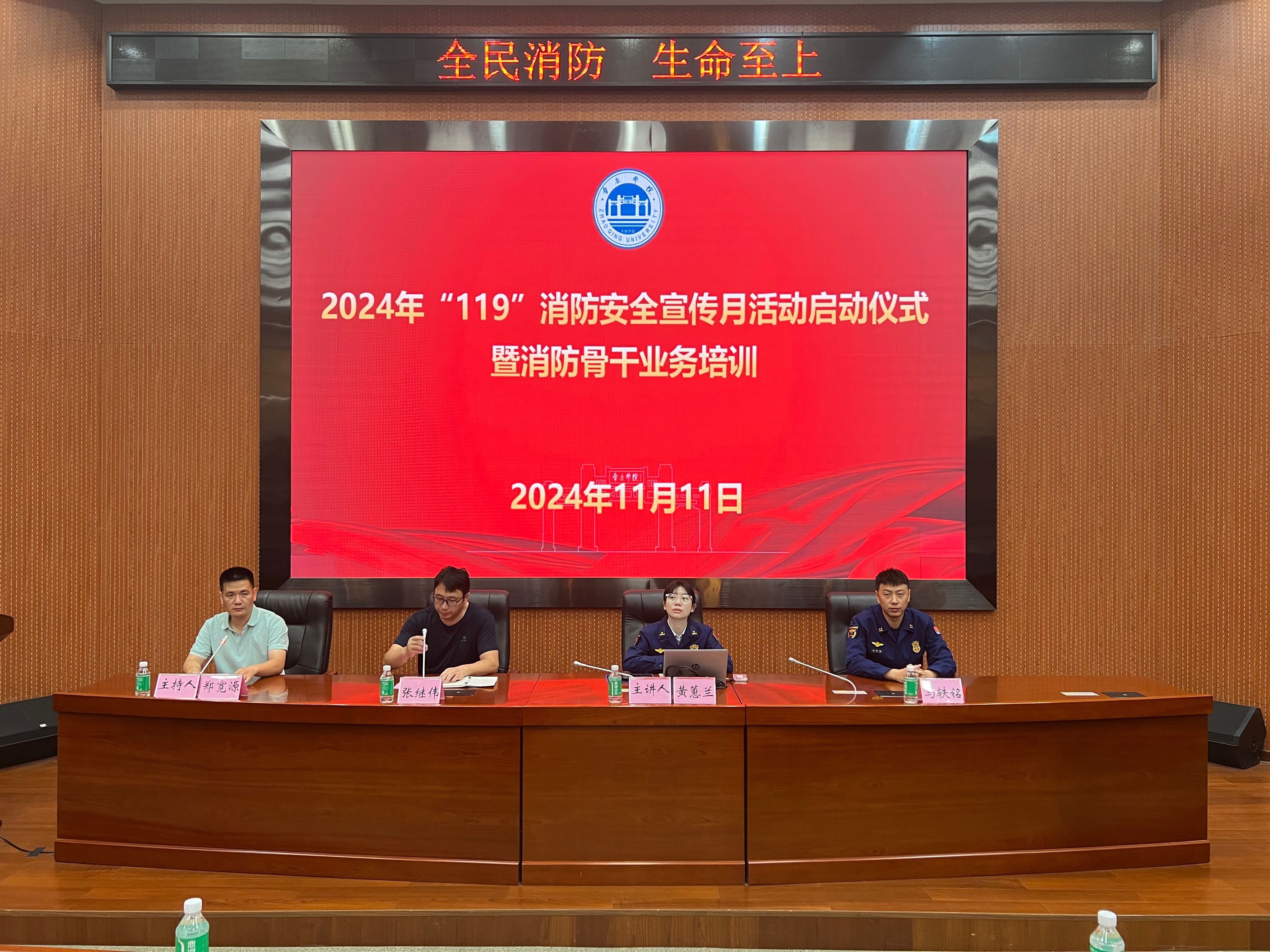 我校联合市消防支队和端州区消防救援大队举办2024年“119”消防安全宣传月活动启动仪式暨消防骨干业务培训。培训会由市消防支队主任黄蕙兰主讲,保卫部消防科副科长郑宽源主持,有关职能部门及各二级学院消防安全工作负责人、消防安全管理员及实验员、保卫部全体人员、总务后勤部经营户代表、大学科技园园区公司代表和学生骨干代表共420人参加。
