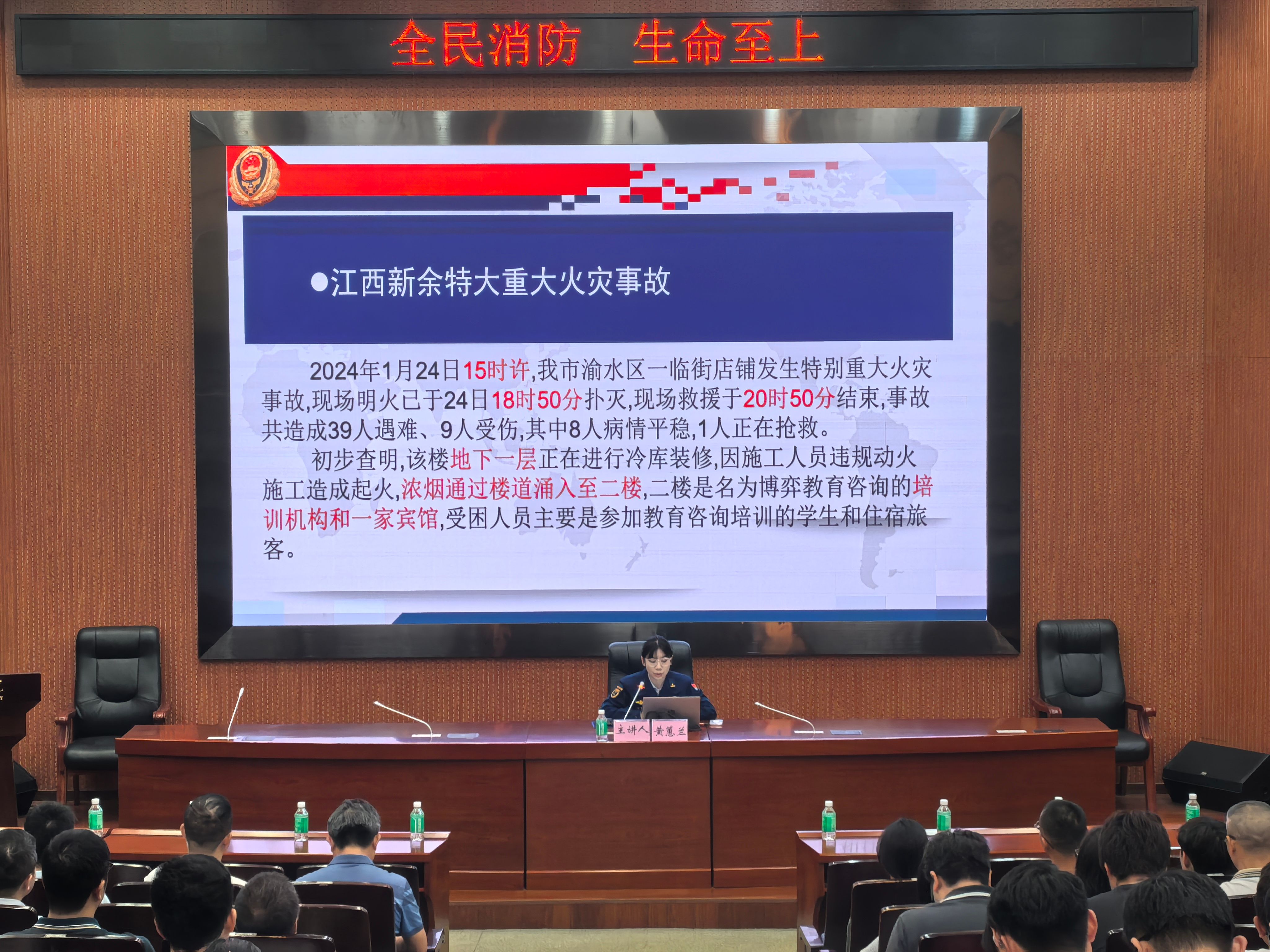 黄蕙兰围绕火灾现场特点、疏散逃生知识、成功处置火灾初期、日常履行职责等方面,向师生们深入介绍做好消防安全工作的方法及其重要性。牢固树立责任意识,认真履行消防工作职责,贯彻落实消防工作要求;强调广大师生要增强风险辨识意识,不断提高自防自救能力。