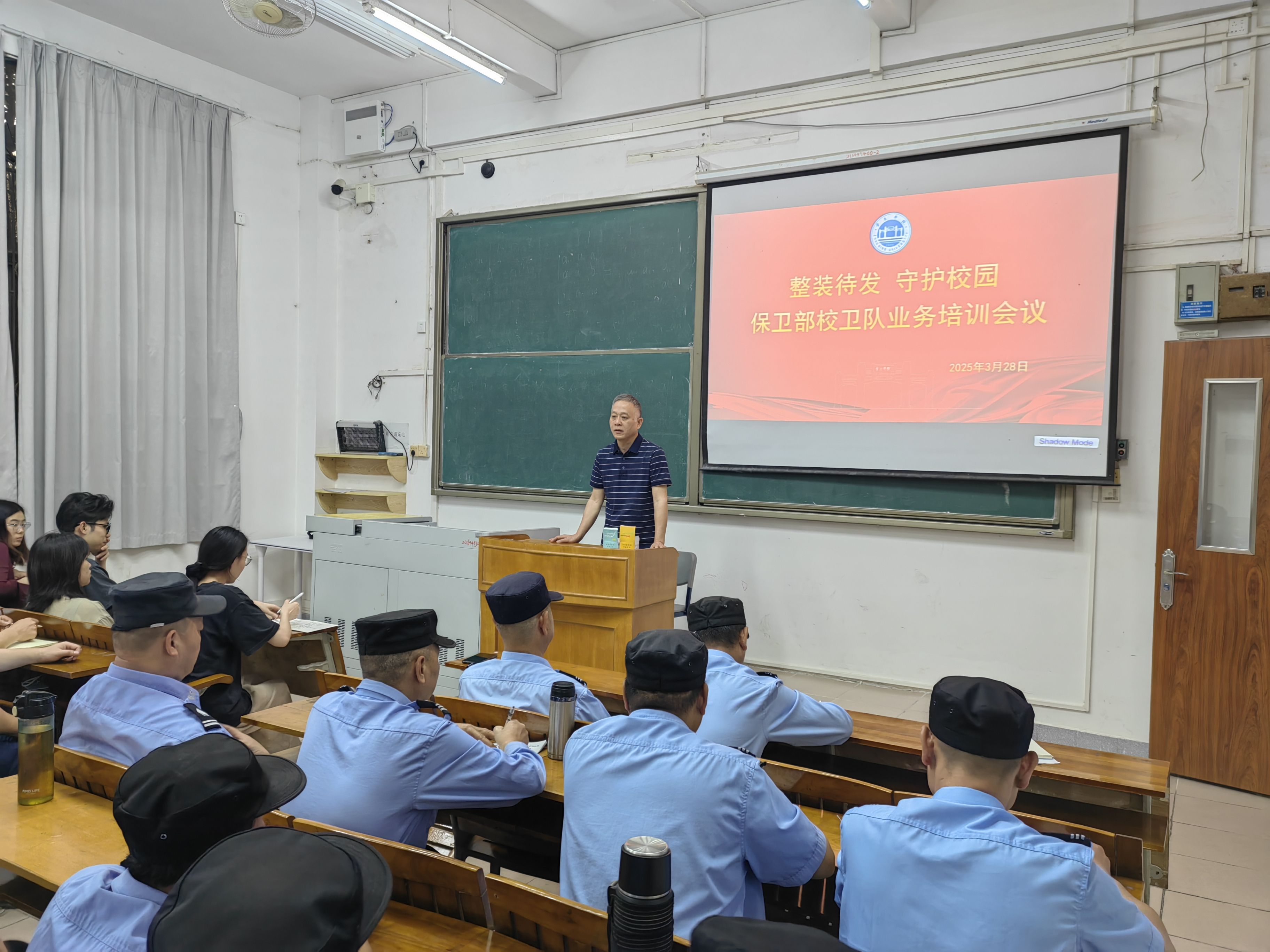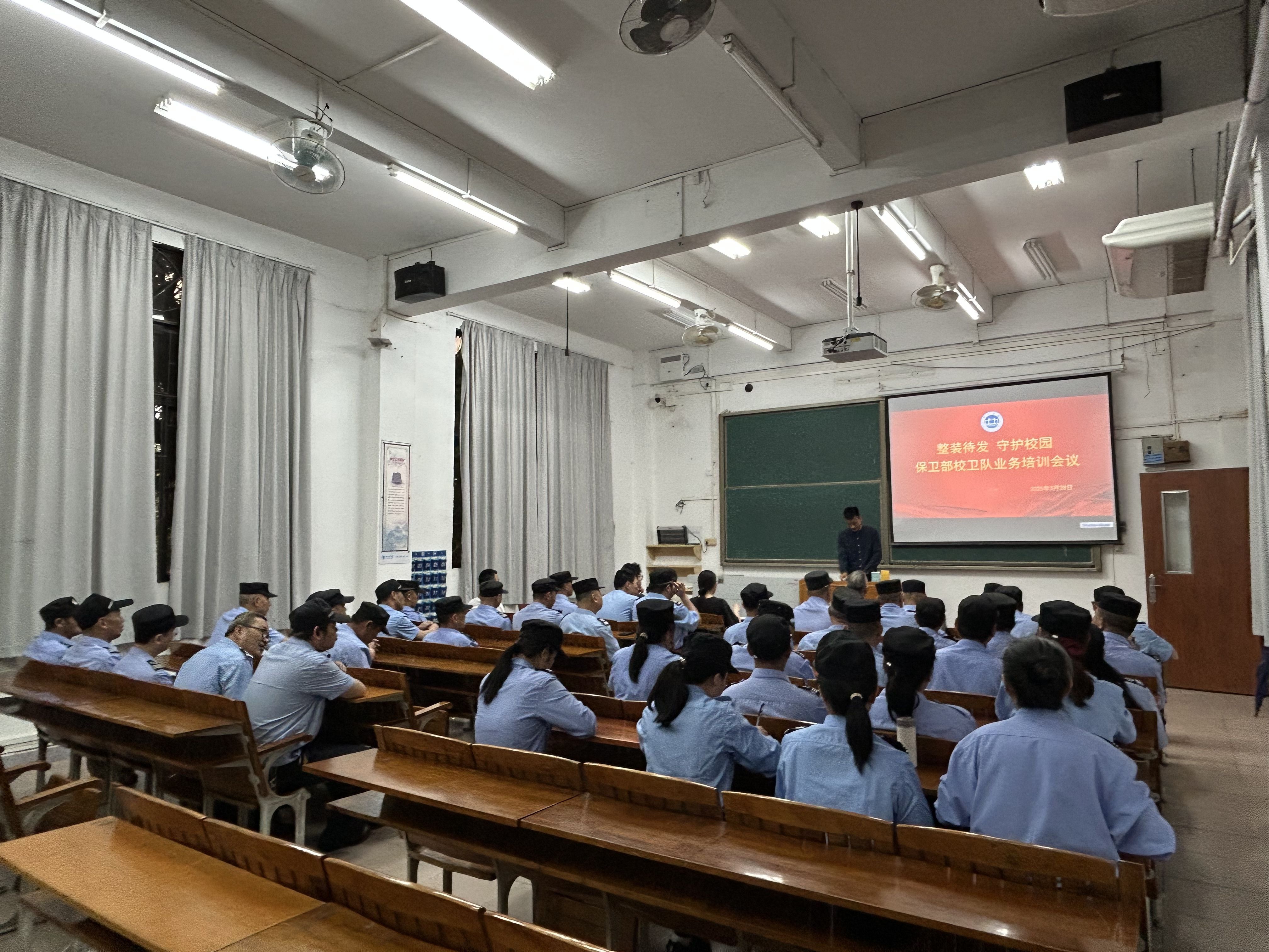 为深入贯彻中央八项规定精神学习教育,促使党建工作与日常工作高度融合,进一步强化内部管理、凝聚团队精神,全面提升保卫部校卫队政治素养和业务能力,保卫部于2025年3月28日下午组织全体校卫队员召开业务培训会及中央八项规定精神学习教育。本次会议由治安科副科长陈文勇主持。保卫部副部长赖剑波出席会议。