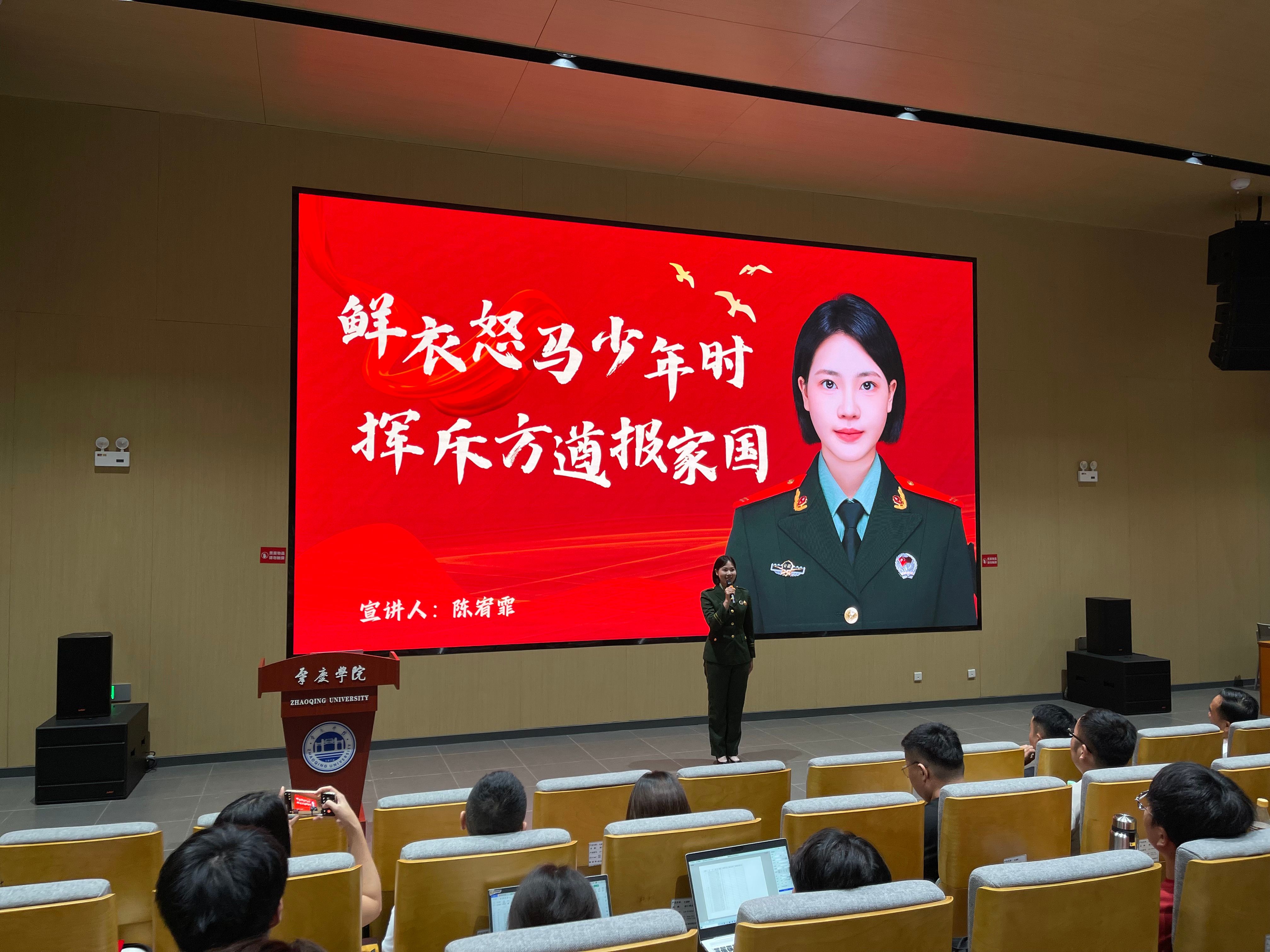 表彰会结束后,4名征兵宣讲员通过图文结合方式展现军人先进典型事迹,并与现场学生积极互动,加深学生对军营生活的了解,强化学生对参军入伍重大意义的认识,号召广大青年要有参军报国热心和决心,结合自身意愿和情况积极主动参军入伍,宣讲活动取得圆满成功。