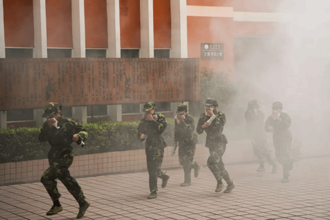 在模拟火灾现场,新生们更是用实际行动打了个好样,随着警报声的响起,同学们迅速做出反应,用手捂住口鼻弯腰低姿,沿着既定的逃生路线快速撤离,教官们在关键位置引导同学,确保大家安全到达指定的集合地点,到达集合地点后,各连教官迅速清点人数,并向现场总指挥报告。