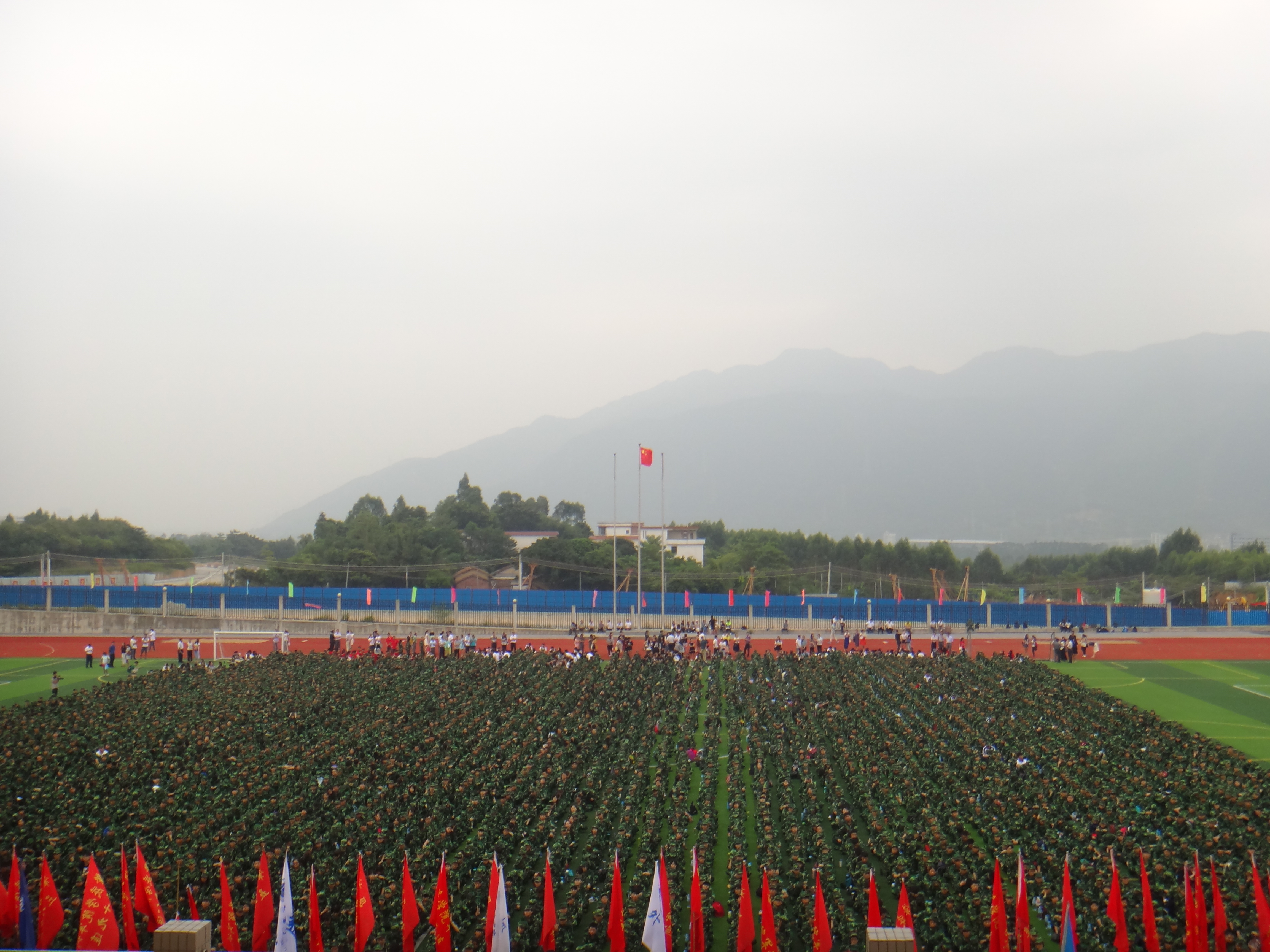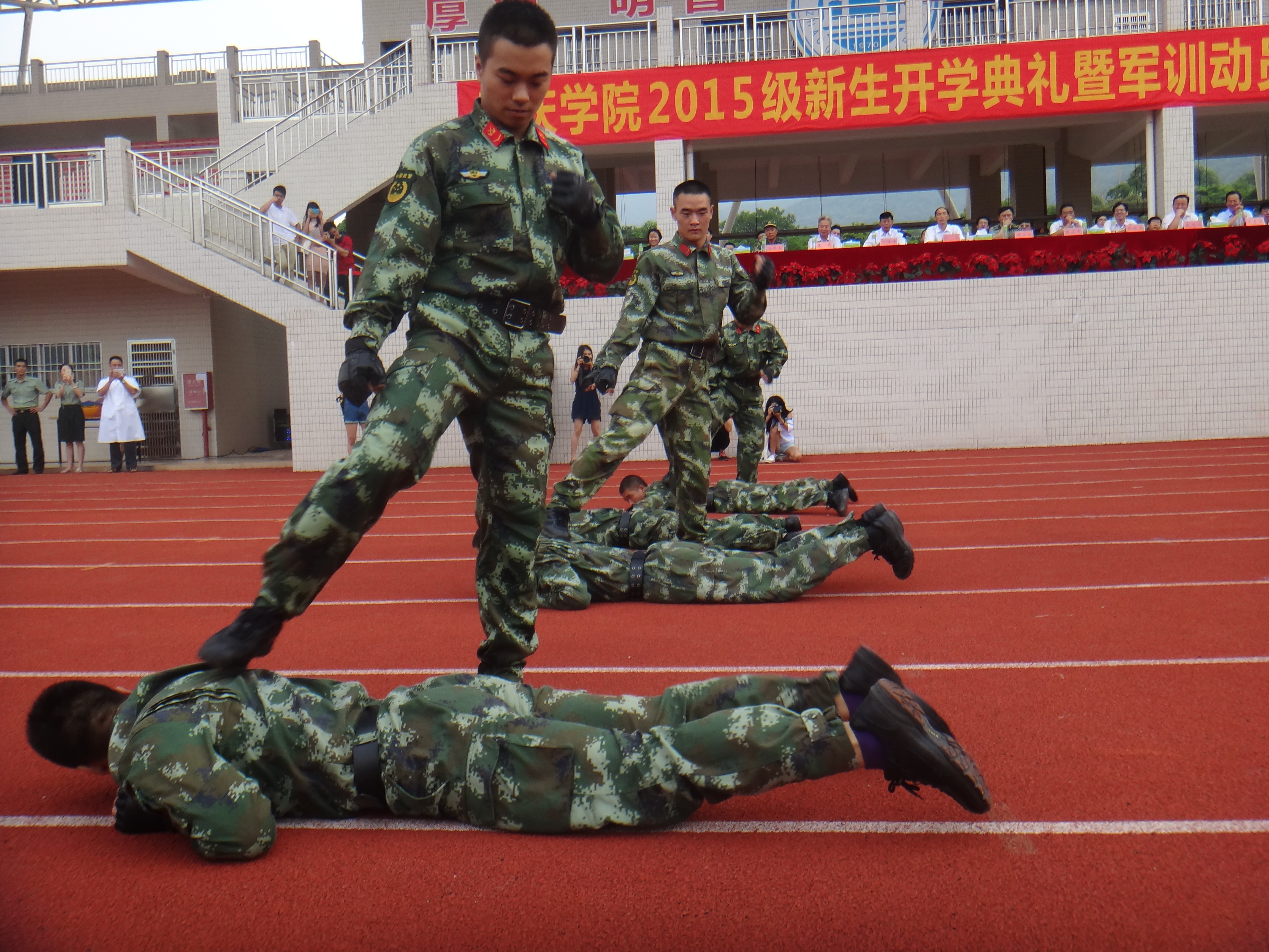 2015年9月14日上午,我校在第二田径场举行了隆重的新生开学典礼暨军训动员大会。校长和飞、校党委副书记叶峥嵘、肇庆军分区政委陈万仕、武装部部长毛致光及各有关单位负责人出席典礼。