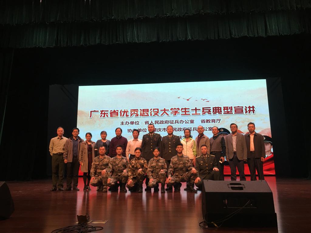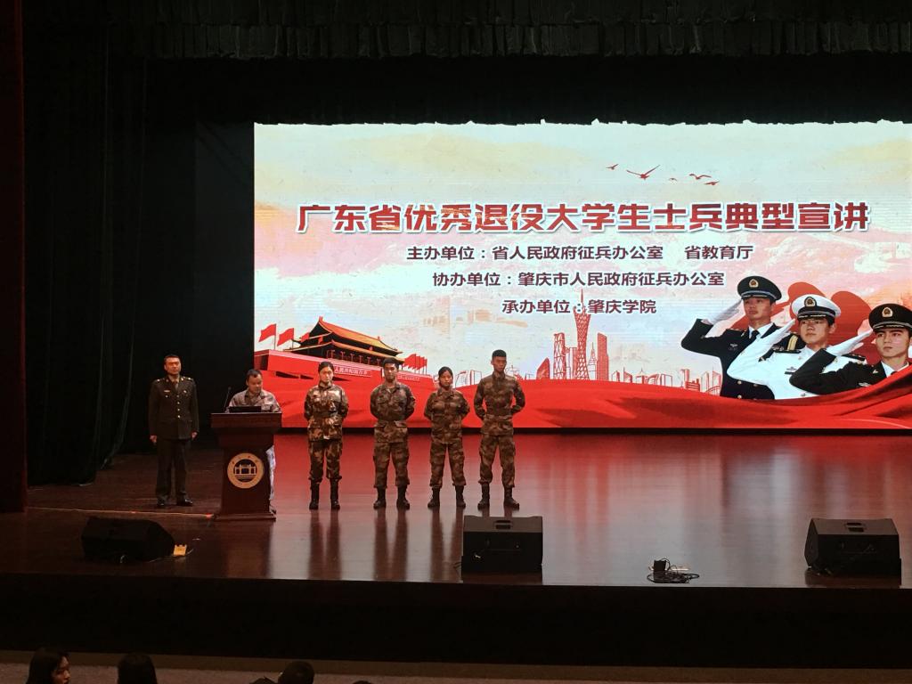 为进一步激发我校学子参军报国热情、在全校营造浓厚的征兵工作氛围,12月17日上午,由广东省人民政府征兵办公室、省教育厅主办,我校承办的广东省优秀退役大学生士兵典型宣讲会在我校艺术中心顺利举行。我们邀请了肇庆市军分区王振坤参谋,优秀退伍大学生士兵代表戚灼怀、张燕珊、刘芬秀、徐晓钏,学校武装部干部职工、各二级学院党委副书记、负责征兵工作的辅导员以及学生代表共1000余人参加。会议由我校武装部部长、征兵工作站站长黄镜辉主持。