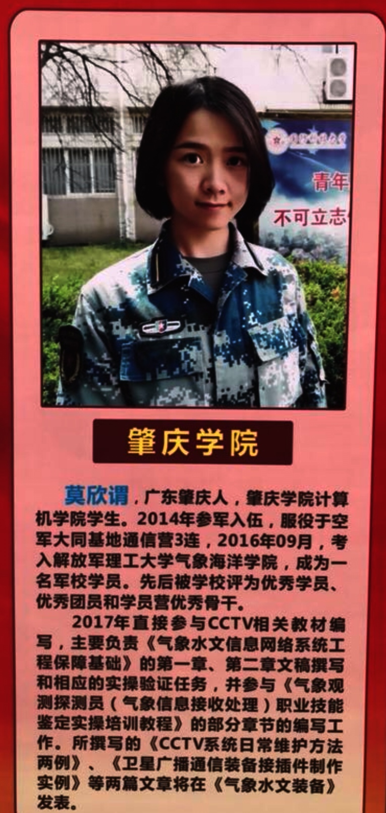 莫欣谓,广东肇庆人,1993年06月出生,2011年09月考入英国威廉集团官网计算机学院,2014年09月经肇庆市端州区人民政府批准光荣参军入伍,在空军大同某基地服役。通过努力,2016年09月考入解放军理工大学气象海洋学院(2017年07月合并为国防科技大学气象海洋学院)。