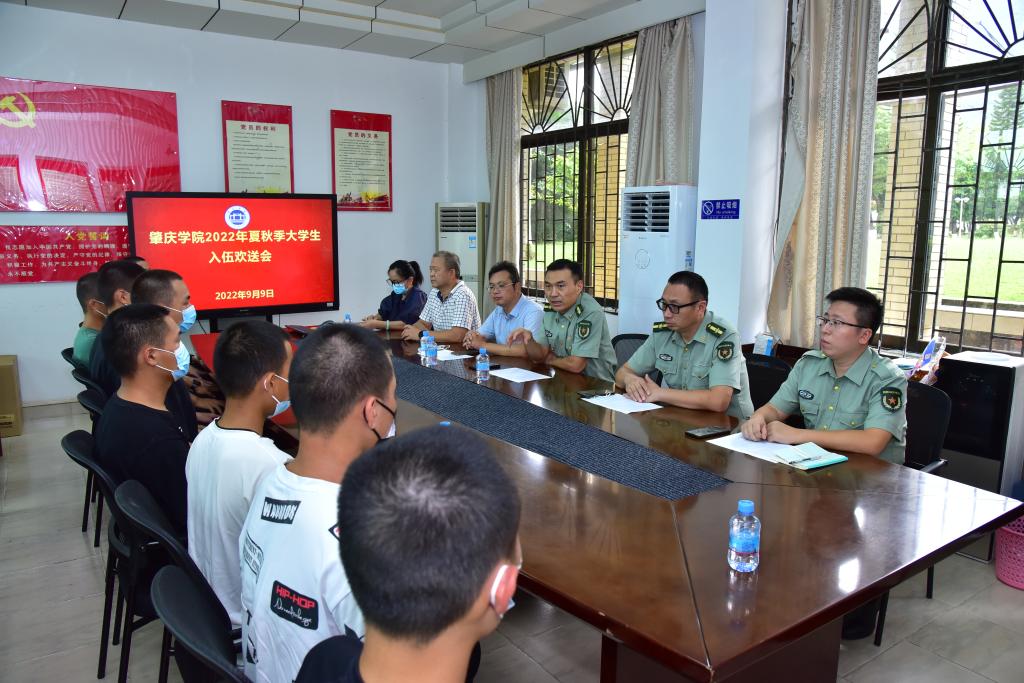9月9日下午,我校在行政楼第一会议室举行2022年夏秋季大学生入伍欢送会,为我校即将踏上军旅征程的10名新兵送行。校党委副书记谢冠华、学工处处长陈向荣、武装部部长黄镜辉、副部长张根祥及相关二级学院副书记、辅导员、武装部干事、全体新兵等参加欢送会。会议由我部副部长张根祥主持。