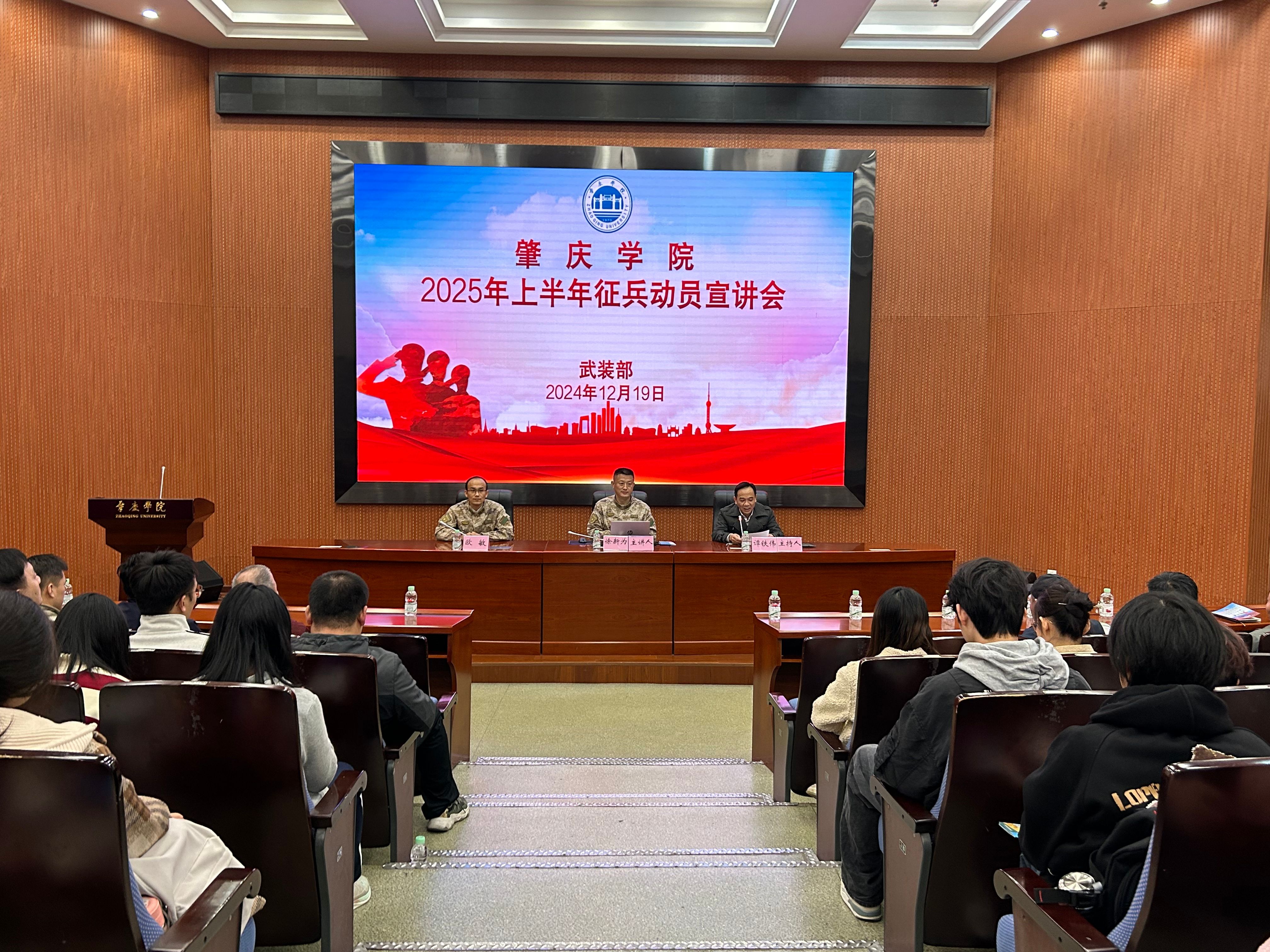 为贯彻落实习近平强军思想,激发学生爱国情怀,进一步加强征兵政策宣传,普及国防意识,鼓励更多优秀砚园学子投身军营建功立业,学校武装部于2024年12月19日在学校图书馆学术报告厅举办了2025年上半年征兵动员宣讲会。出席宣讲会的特邀嘉宾有肇庆军分区动员处副处长徐新为、端州区武装部军事科科长欧敏。宣讲会由保卫部(武装部)部长谭铁伟主持,各二级学院党委副书记、分管征兵工作的辅导员及各学院学生代表参会。